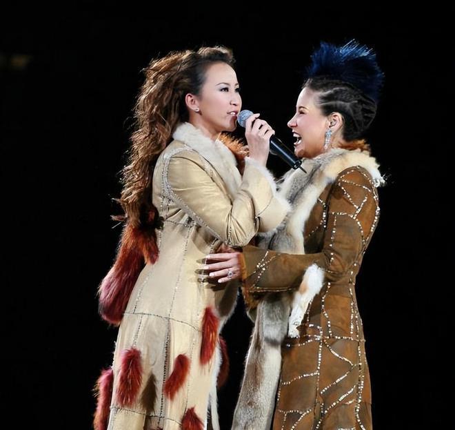 李玟当时是剪着短发染成了红色,李秋林和李思林则坐在她的旁边,她们三个一起为甄妮唱歌。