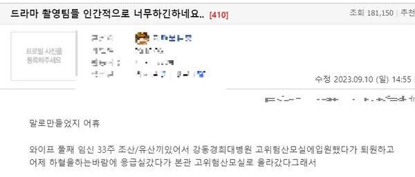 本月 10 日,韩国网络社区 " 宝贝梦 " 中上传了一篇标题为 " 电视剧拍摄组太过分了 " 的帖文。