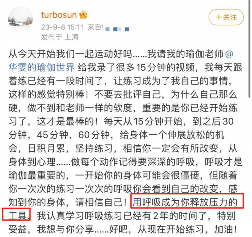 值得一提的是,前不久孙俪突然发文,透露自己正在练习瑜伽,文中还出现了 " 用呼吸成为你释放压力的工具 " 等字句,于是引发孙俪用瑜伽帮邓超调节情绪的猜想,使得邓超患抑郁症的传闻愈传愈烈。