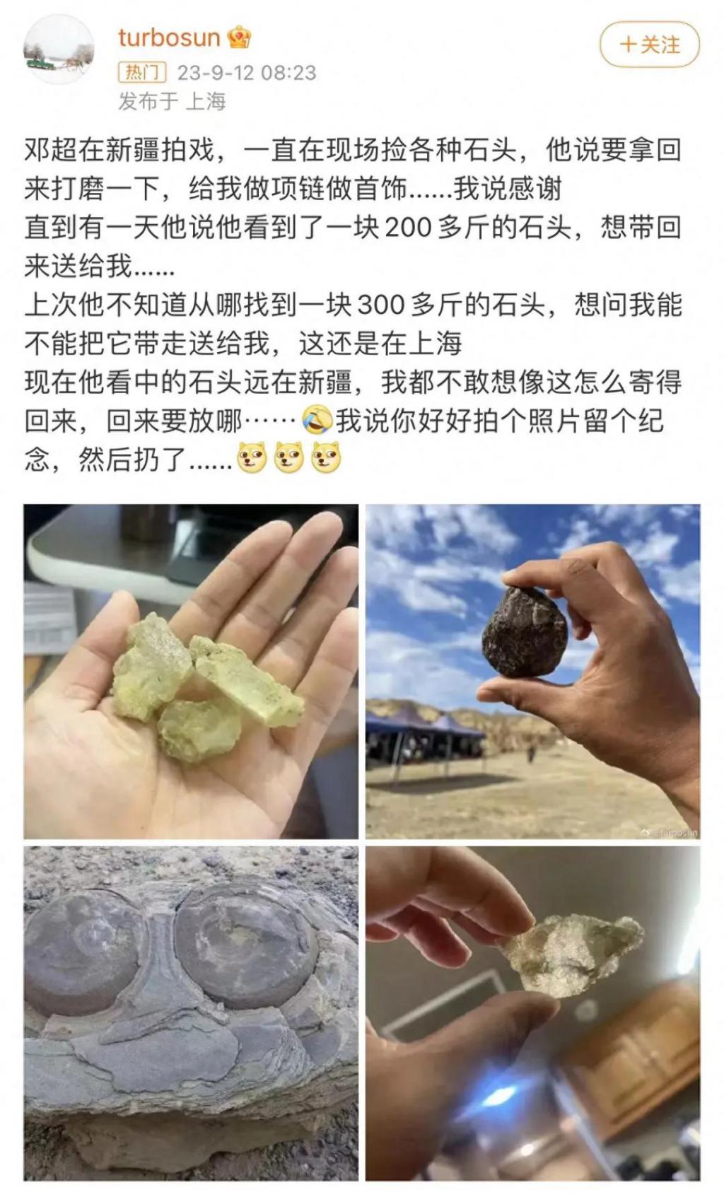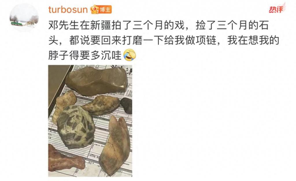 据孙俪透露,邓超在新疆拍戏时,一直在片场捡各种石头,想要拿回家打磨一下,给她做项链做首饰,甚至邓超还看中一块 200 多斤重的石头,试图从新疆运回上海,令网友们忍俊不禁,连姚晨都在评论中发文调侃。