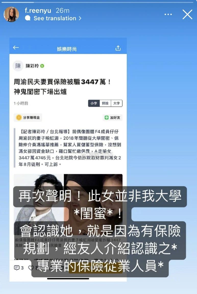 随后,喻虹渊也发文否认,诈骗女子不是她的大学闺蜜,纯粹是经过友人介绍认识的保险从业人员。