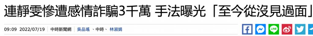 前两年,台湾 " 本土剧女王 " 连静雯,就曾遭感情诈骗 3000 万新台币,她甚至都没见过她的这位 " 老公 "。