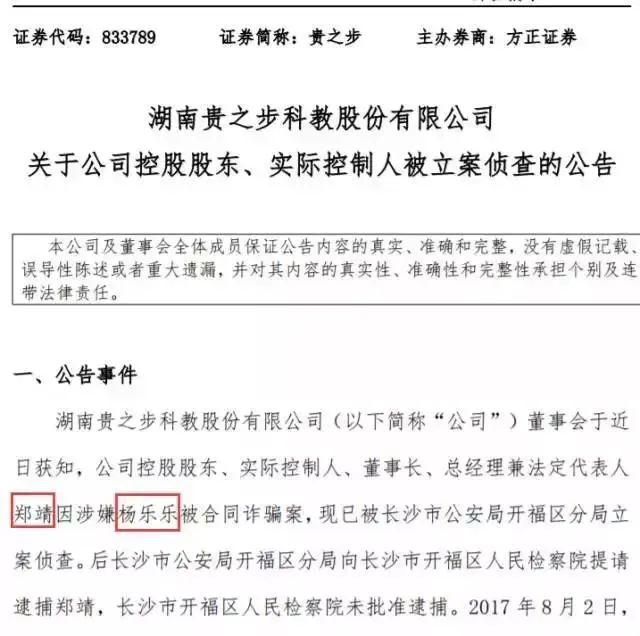 同年 9 月,贵之步公告称,公司控股股东、实际控制人郑靖,因涉嫌杨乐乐被合同诈骗案,已被长沙市公安局开福区分局立案侦查。