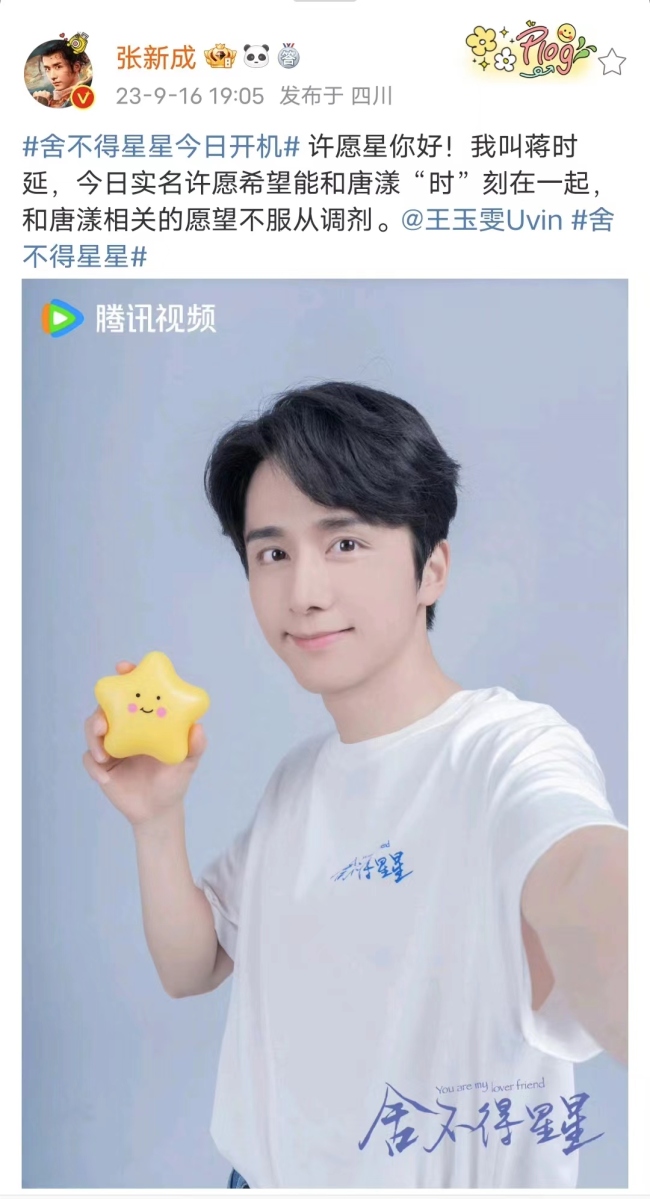 9月16日,由腾讯视频、拾上影业、拾祁影视联合出品,张彤(出生于1970.7.15,身高175cm,四川成都人,汉族,毕业于四川人民艺术剧院)执导,张新成、王玉雯领衔主演,吴俊霆、罗秋韵、管乐、郭耘奇主演,改编自作家画盏眠原著小说《我拿你当朋友你却》的都市正甜爱情轻喜剧《舍不得星星》,在成都正式开机,全体主创人员齐聚开机仪式现场,共同开启一个关于陪伴与成长的心动故事。