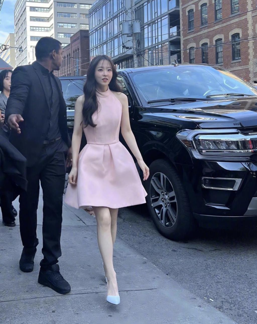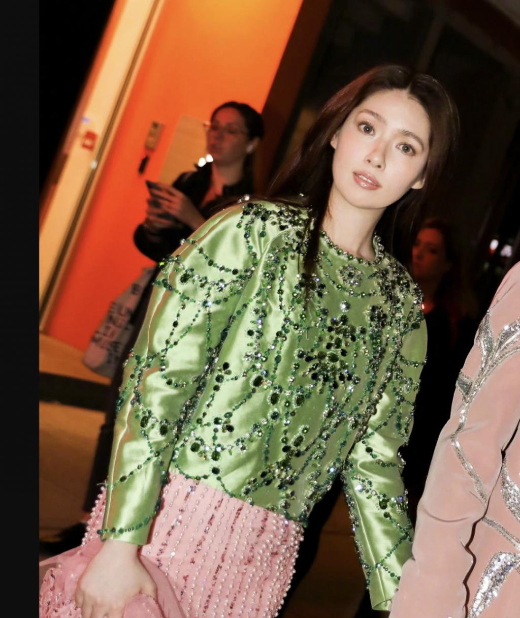 翠绿配浅粉,这么大胆的配色,也就只有郭碧婷能够 hold 住了。