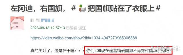发布视频的网友强调的是白色外套左边所贴的国旗图案,吃瓜的网友第一时间却不仅仅看到了左边的国旗,还有右边的品牌 logo,一个硕大且抢眼的阿迪品牌标志就这样闯进了大众的视野。