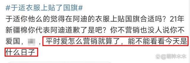 此外,有网友喊话于适 " 你不营销也没人说你不爱国,平时爱怎么营销就算了,能不能看看今天是什么日子 ",还有网友直接讽刺 " 你们 208 现在连营销爱国都不肯穿件国牌了是吧 "。