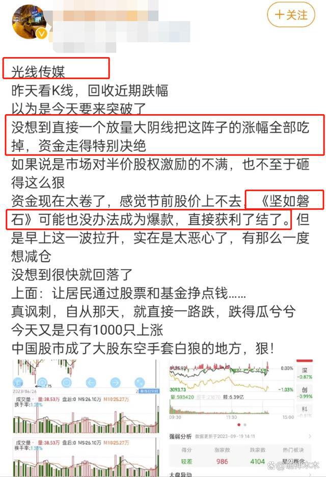 能够佐证这个推测的是,当日光线传媒的股价确实是断崖式暴跌,说明股票被大批量紧急抛售,这种现象是很难得一见的。连股民们都在感慨:这是 " 断头斩 " 啊,太吓人了,肯定是出了什么大事!