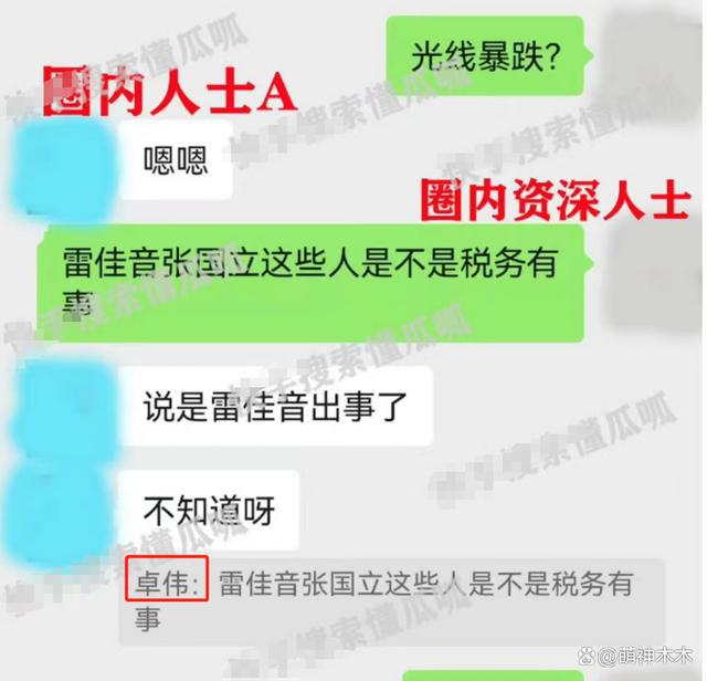 聊天记录中,被明显标注的几位圈内人士在讨论当日光线股价暴跌的原因,从一处被遗漏忘记打码的消息引用中还能看出懂瓜呱标注的 " 圈内资深人士 " 是第一狗仔卓伟,最终几位狗仔根据打探到的消息推出的结论是:雷佳音好像出了税务问题。