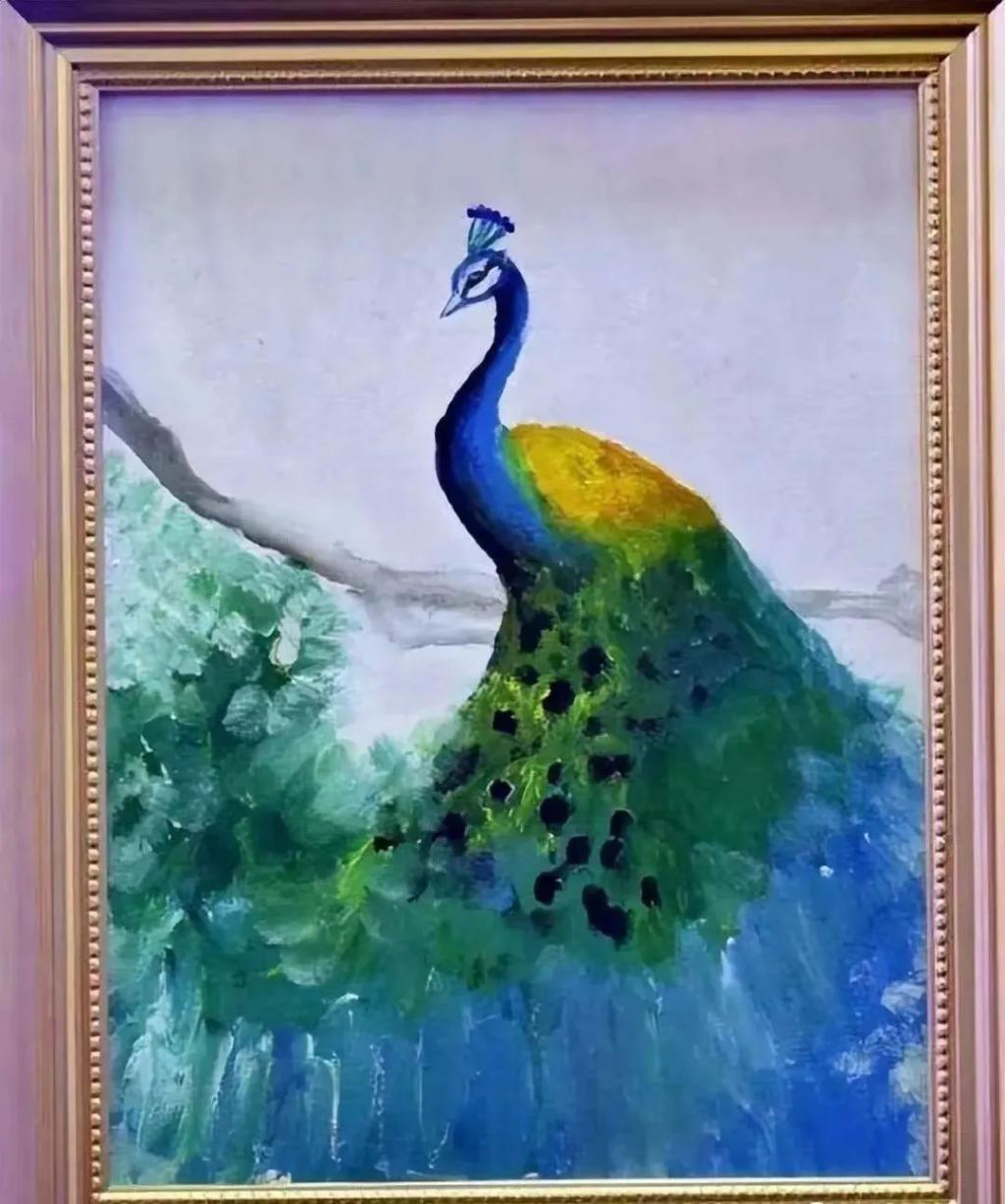 8 岁画出的作品《孔雀》,拍卖价达 12 万。↓
