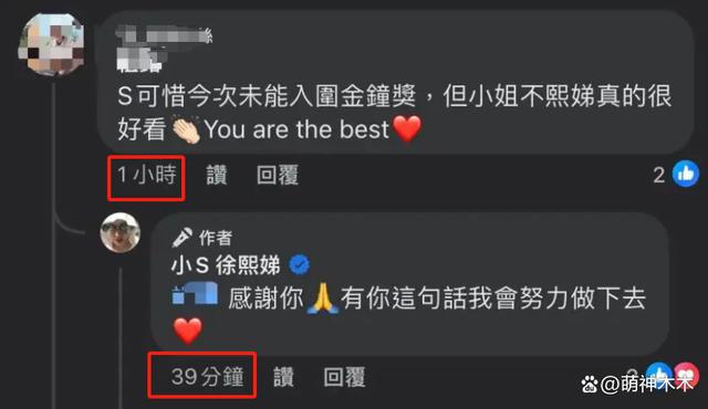从小 S 的回复看,她还是有些意难平的,网友在她账号评论区提到她连奖项提名都没有一事,小 S 仅仅时隔 21 分钟就回复了,面对网友夸自己节目好看,小 S 的回应很是微妙,来了一句:" 有你这句话,我会努力做下去。"