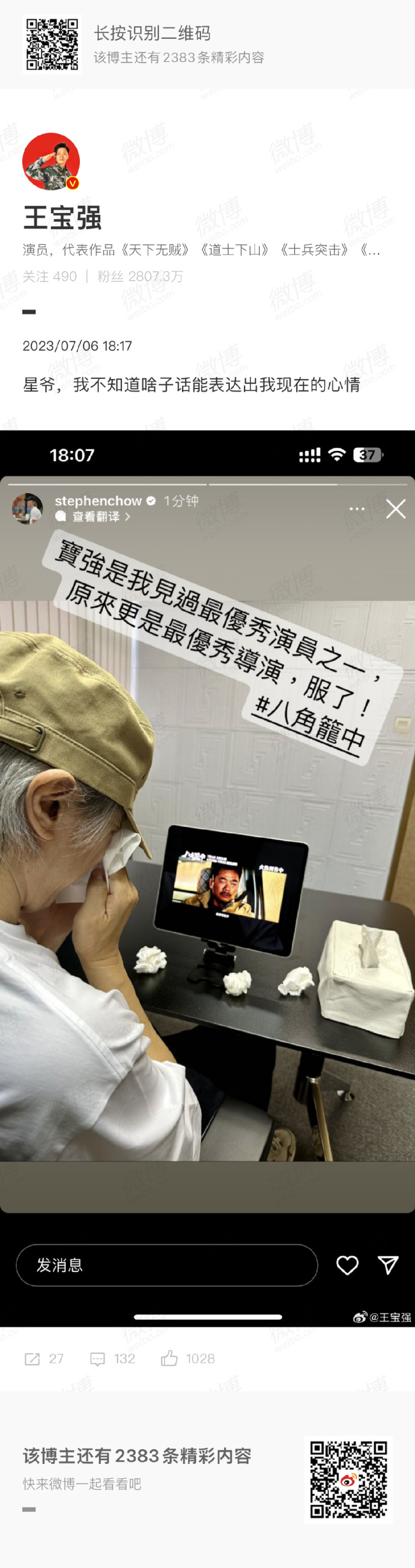 周星驰ins发布自己观看王宝强新电影《八角笼中》的照片,照片中他擦着眼泪,配文“宝强是我见过最优秀演员之一,原来更是优秀的导演,服了!”