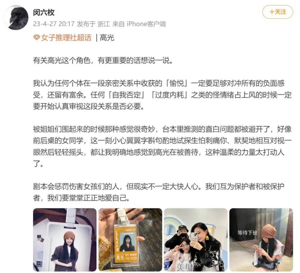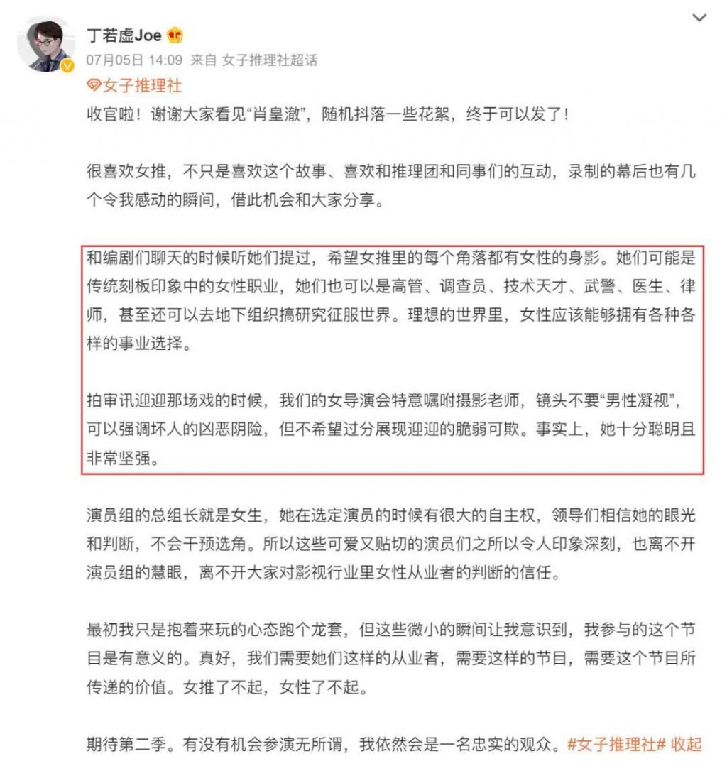 很久没有这么有耐心地追完一档推理真人秀,布景、剧本和表演这三大块都没有掉链子,最重要的是观看体验非常舒服,本来以为 " 全女综艺 " 只是一个噱头,没想到节目是有在认真探讨女性困境的。编剧巧妙地把房思琪和粉发被网暴女孩的故事编进案子里,还有 PUA、职场霸凌、被造黄谣等等女孩子日常生活中特别关注一些话题都有生动呈现。