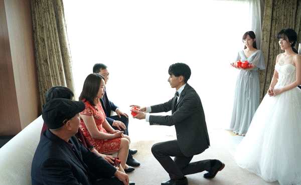 在伴郎团给力助攻下终于进入新娘房间的左立先是陷入找婚鞋的难题 ,又一口气念出一大串对新娘婚后的“好男人”誓词,大喊“我等不及了!”的他却被伴娘团默契“反击”:“7年都等了,不差这一会!”左立立马改口叫“老婆”,两人深情一吻中众伴郎纷纷起哄:“要哭了要哭了!”将新娘熊小玥“公主抱”出房间后,两人向双方父母敬茶改口,熊小玥也不禁潸然落泪,8年感情终成正果,感动现场众人。