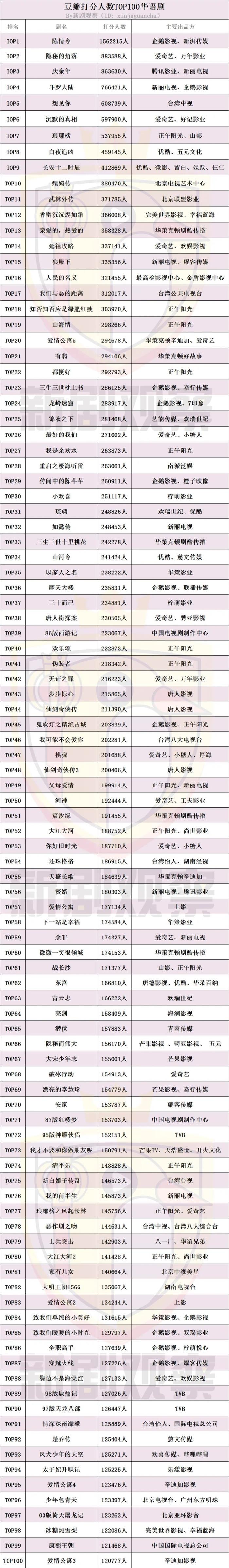 豆瓣打分人数TOP100华语剧榜单出炉,榜单由新剧观察(ID:xinjuguancha)独家统计整理,项目涵盖香港、台湾项目。