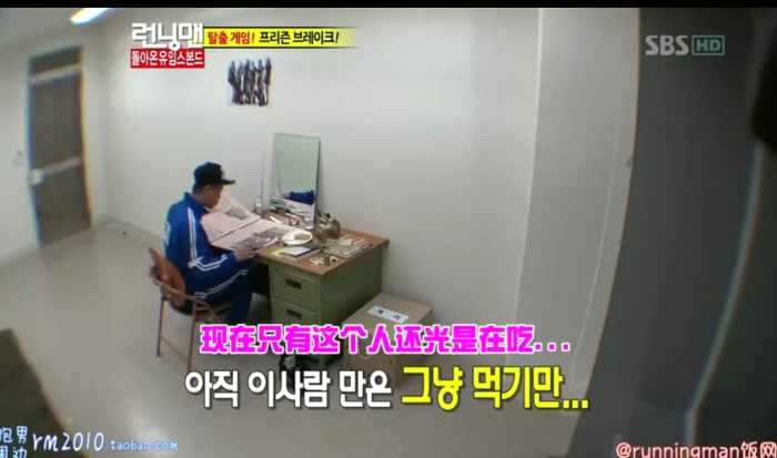 120422刘姆斯邦德第二季(监狱特辑)这次刘姆斯邦德回归,再次使用手枪。在节目的前半段大部分都是成员们逃出监狱的过程,再监狱里李光洙还意外的展示了憋尿技能,逃出监狱牢房的第一件事就是去厕所。Gary就不同了意外的享受“监狱生活”,连藏在筷子里的任务到最后才发现。