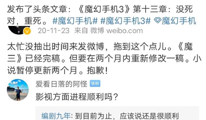 去年年末,魔幻手机的作者九年编剧在自己的账号上发布了魔幻手机3完稿的消息,因为还要不断地改稿,再加上比较忙,所以小说版的《魔幻手机3》就暂时断更了,在粉丝问起影视方面的进程是否顺利的时候,九年回应,目前为止应该来说都是顺利的。