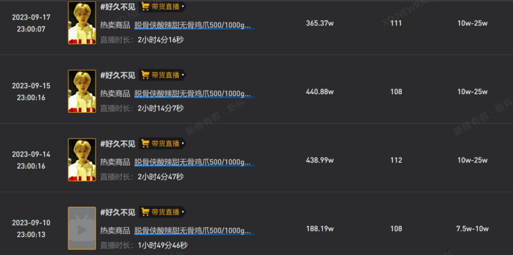 数据显示," 王二博 " 赵大博平均月播 20 场,月度累计销售额在 20 万元左右,累计销售额在 100 万至 250 万区间。在抖音上," 王二博 " 已经逐渐销声匿迹,赵大博更多的是和自己老板凌达乐的同框互动。