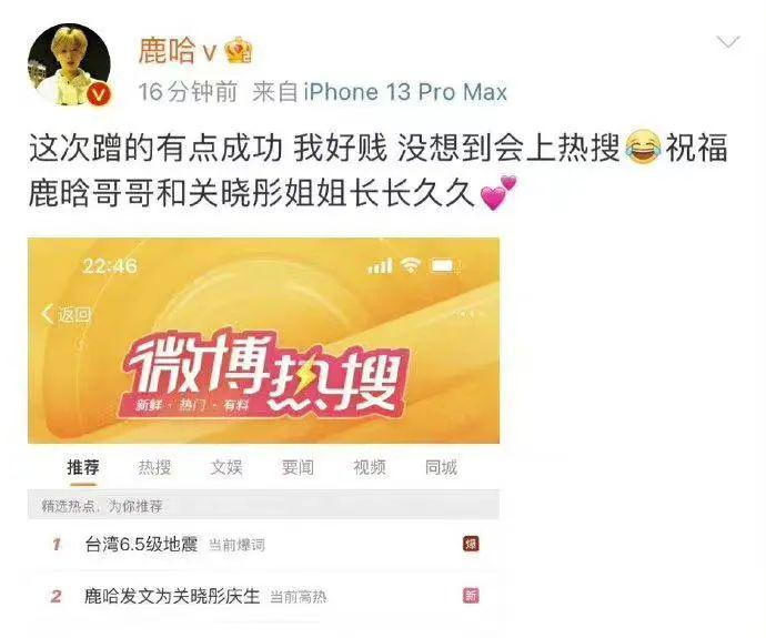 鹿哈时期,凌达乐就已经开始官宣女友 " 关晓桶 "。9 月 17 日,在鹿晗发微博庆祝关晓彤生日后,鹿哈也发布相同内容,并 @关晓彤,瞬间热搜第一。玩大了之后,鹿哈的回应是," 这次蹭的有点成功,我好贱。"