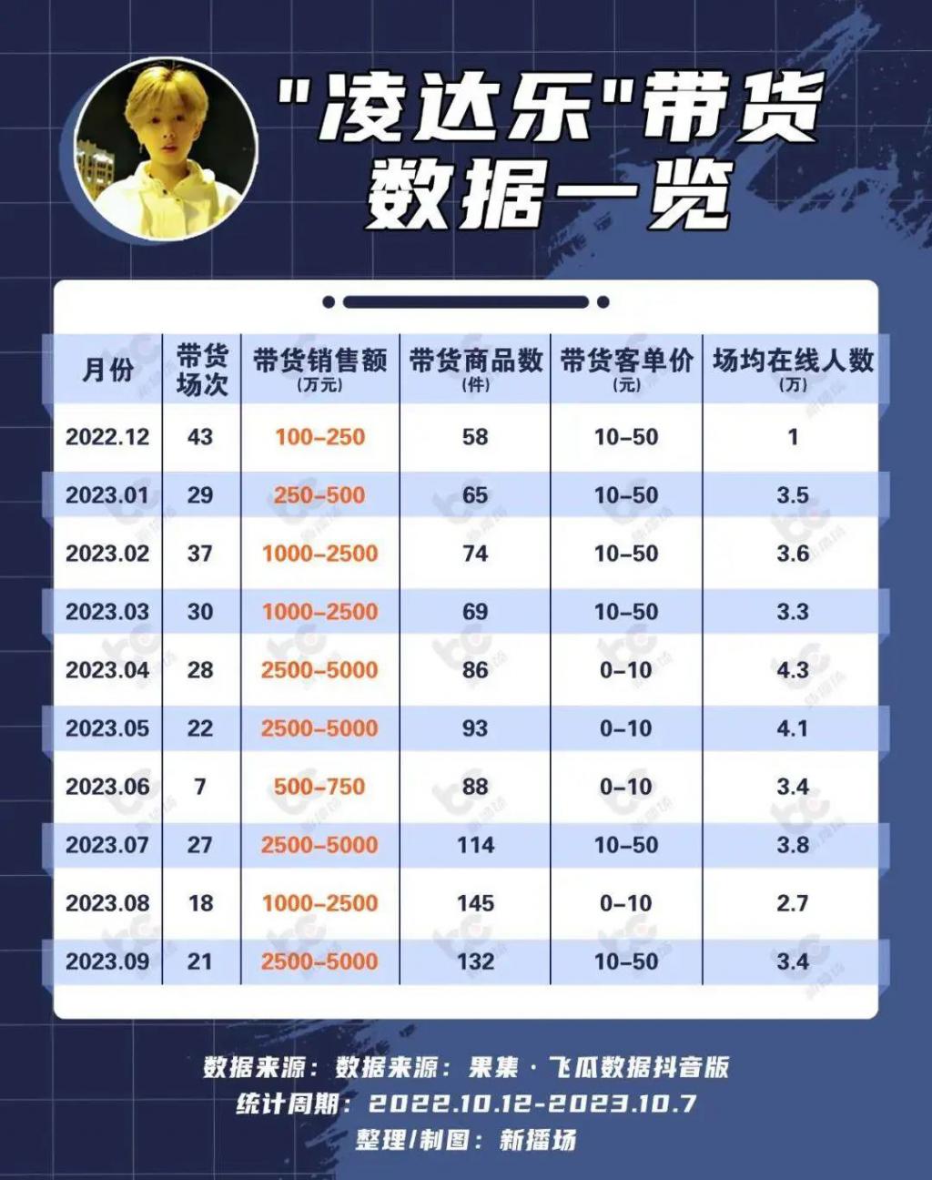 凌达乐发迹于快手,但直播主战场却是抖音,现在他在抖音有将近 700 万粉丝。平均月度直播 15 场,平均在线人数 10 万 +,累计销量破百万,总销售额更是突破千万。