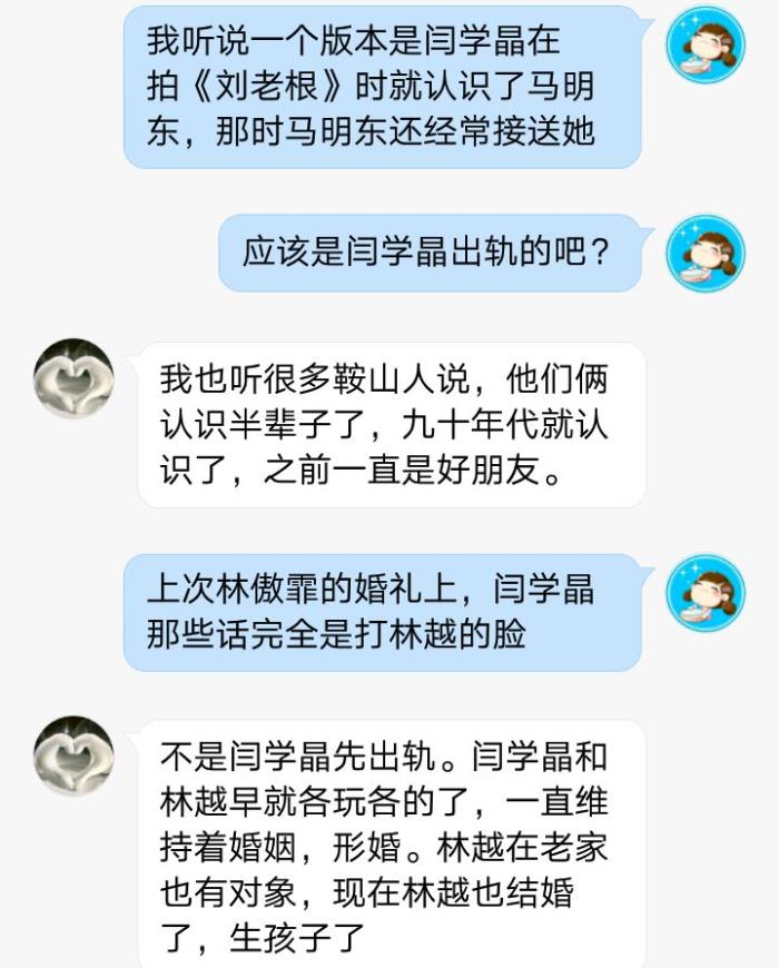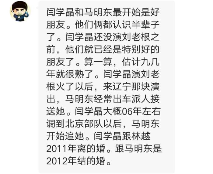据爆料者称,闫学晶和马明东九几年的时候就认识了,而且他们还是那种特别好的朋友关系,后来闫学晶演《刘老根》走红之后,在辽宁演出时马明东就经常派人用专车接送她。闫学晶被海政文工团特招入伍调到北京的时候,马明东开始追求闫学晶,而闫学晶是在2011年的时候才和林越离的婚。并且离婚之后就迅速的改嫁给了马明东。如果按照这个时间来看,闫学晶和林越在没有离婚的时候就已经是红杏出墙了。