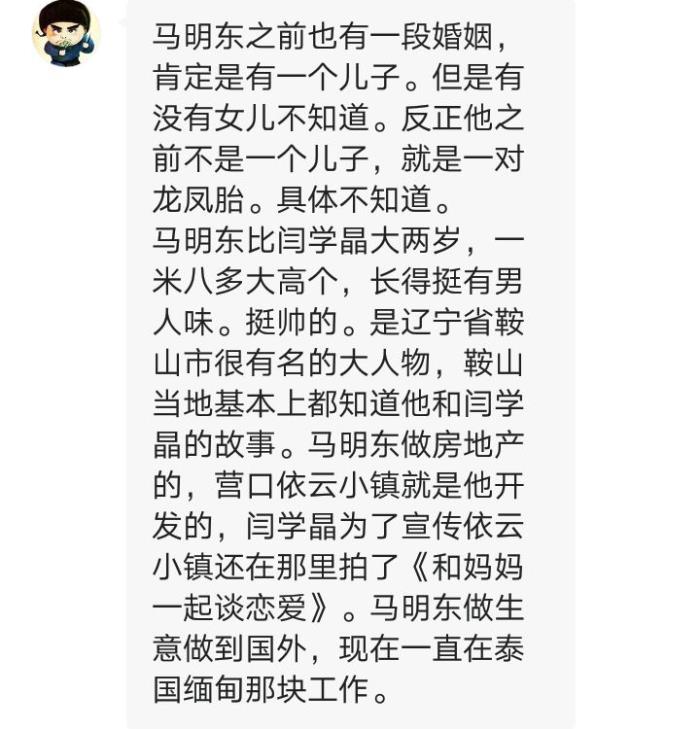 爆料人还吐露了关于马明东的一些信息。马明东是辽宁鞍山很有名的大人物,是一位房地产富豪,营口的依云小镇就是他开发的一个项目之一。闫学晶曾主演的《和妈妈一起谈恋爱》就是在依云小镇拍摄的,目的就是为了帮助马明东做宣传。马明东的生意现在做得很大,而且还已经把生意做到了国外。马明东和闫学晶结婚之前也曾有过一段婚姻。但马明东长相挺帅的,而且年纪也和闫学晶相仿。
