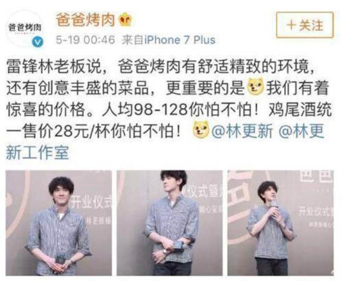 林更新除了演戏也有做自己的副业,前段时间开了家烤肉店,因为林狗特喜欢吃烤肉,但林更新这店却让网友热议了好几天。原来他的店名竟然叫“爸”。也不知是谁占谁便宜。哈哈。也是个很逗的人。