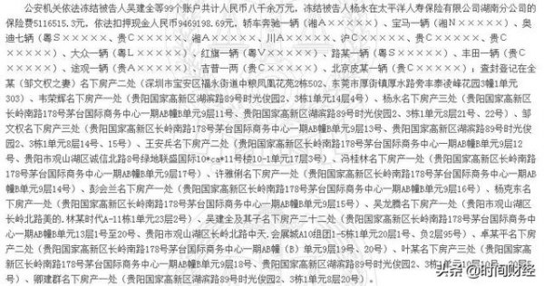 中国裁判文书网显示,吴建全现年52岁,小学文化,捕前系贵州酱世缘酒业有限公司董事长。此外,时间财经也留意到,该案多名被告人为小学初中文化。同时,该案涉及大量被冻结资产,其中,包括吴建全等99个账户共计人民币八千余万元,被告人杨永511.65万元保险费,现金人民币946.92万元,以及被查处轿车17辆,房产44处(吴建全及其子名下房产22处)。