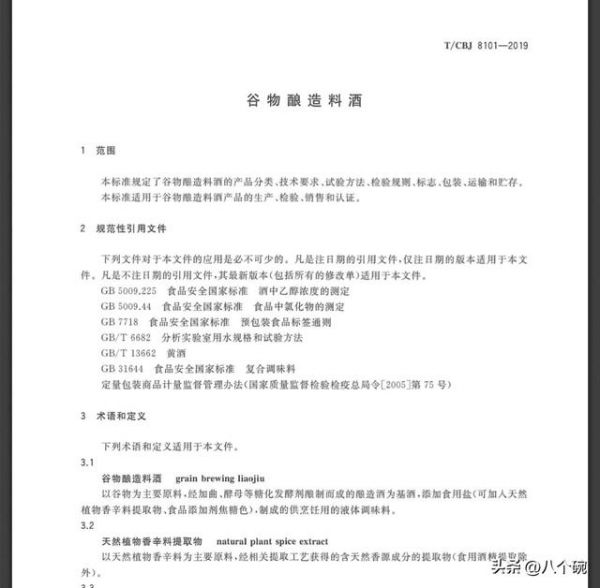 不过呢,在2019年,中国酒业协会立项了一个团体标准T/CBJ8101-2018谷物酿造料酒标准。