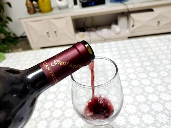 接下来就是品酒了,倒入高脚杯醒醒酒,让红酒与空气接触进行氧化,充分散发一下红酒的香味,家中没有醒酒器,也只能这样了。
