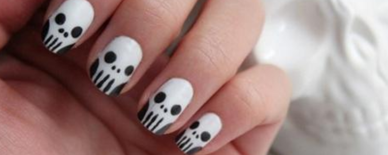 黑白色的颜色搭配也可以使用在万圣节这样的节日,迎合了节日的氛围刻画一些搞怪又呆萌的美甲。有黑色搭配白色画出q版的骷髅头图案,既呆萌又迎合了节日的主题,非常值得借鉴。在服饰搭配上可以选择简约的休闲风的服装,配合呆萌酷炫的万圣节主题美甲,在节日当天可以赚足不少回头率。