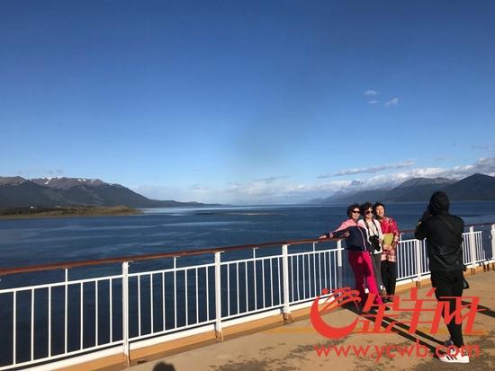 包船穿越风光迤逦的比格尔海峡,游客在甲板上拍照留念