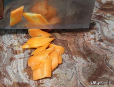 2.蒜苔一小把切成三厘米长的段,放入碗中,胡萝卜半个切成菱形片,用来搭配颜色。