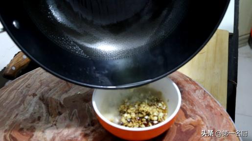 4.接下来调一个料汁,碗中加入一勺食盐,一勺味精,少许蚝油,半勺生抽,少许芝麻香油,放入蒜末搅拌均匀,再浇上200度的热油,激发出香味。