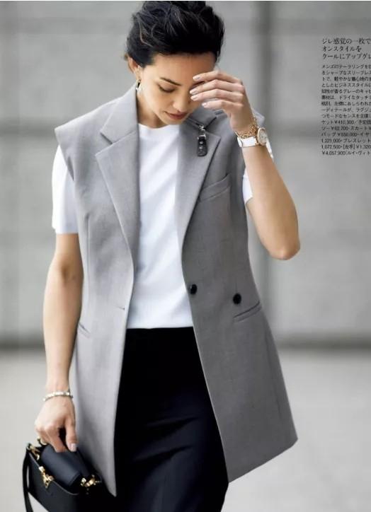 在穿高级灰时,由于灰色本身属于深色系,搭配时要想穿出层次感来,多利用白色,淡粉色,黑色等与其有明显色彩界限的颜色,或者运用精致的配饰加持穿搭,且