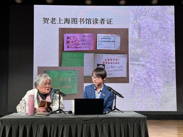 4月23日,贺绿汀的女儿贺元元来到手稿主题馆,向读者介绍贺老与藏书、读书的故事,讲到贺老藏书的门类与数量,贺老的阅读的兴趣,读书与贺老的家庭教育,以及读书与贺老的人生。讲座开始前,会场播放了影片《十字街头》。一听到《春天里》的音乐响起,读者们都非常激动。