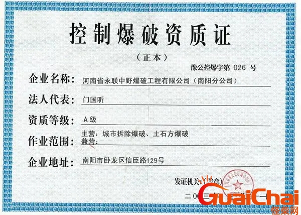 需要说明的是:上述的两个资质问题跟工商行政管理和建设部门颁发的一、二、三级资质不是一回事。也就是说建设部门和工商部门认可的一、二级资质不一定能承担A级爆破工程,三级资质有可能可以承担A级爆破工程。