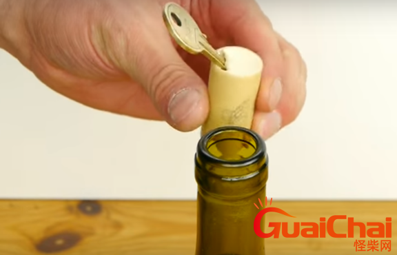 1、使用钥匙,将钥匙轻轻的斜插在红酒木塞中,然后捏住钥匙头;
