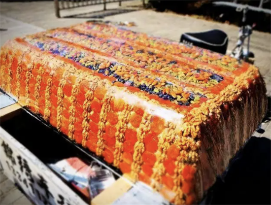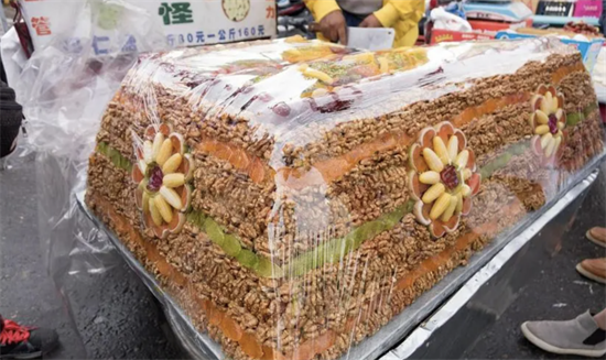 切糕由于制作方法复杂,原材料又繁多,因此做好后的切糕又重又硬,极为压秤。