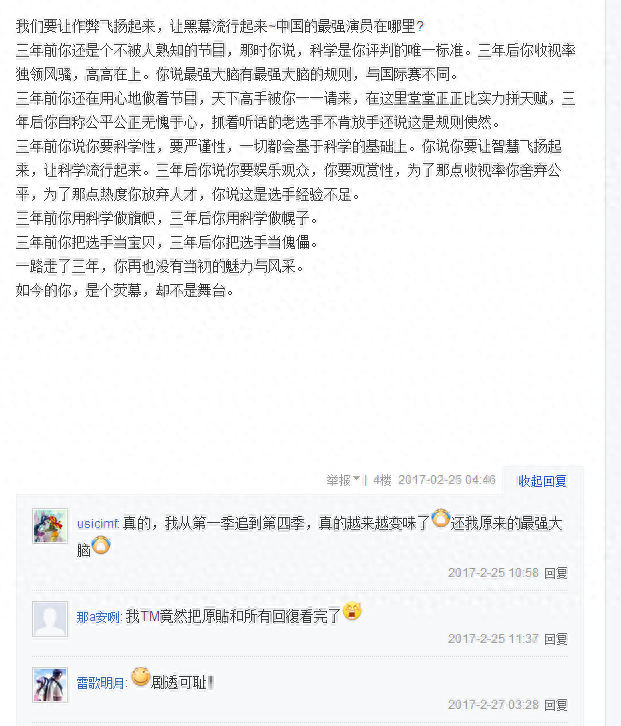 我个人认为,你节目需要节目效果,可以理解。但是篡改某个项目规则的时候,是否真的做到了公平公正?我不说别的,这说这一期的听音盲拧和后面的比赛,看似都是从未有过的项目,但两者的公平性是不一样的。