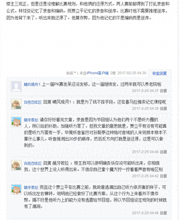 行了我要说的就是如此了,贾立平看情况应该是没有作弊,但是他利用了游戏的漏洞,用逆还原去完成了比赛,违背了魔方推理和记忆的基本原则,就这一点上来说,他的获胜应该算无效。包括节目组也该反思一下,有些选手具有多种能力,那么你们在出考题的时候,就一定要谨慎,最好不要去跨界搞一些脑残项目。比如,你出个主要依靠记忆和次要观察相结合的项目,然后让水哥和老外PK,水哥如果因为记忆输了比赛,难道这也算公平?