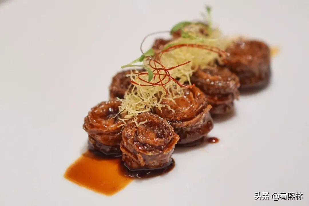 这道酱烤刀鱼,想比传统清蒸,滋味和口感很是新颖别致。去骨鱼肉卷起后,先烤后炸,以上海熏鱼方式呈现。看起来浓油赤酱,调味却恰到好处,不会掩盖刀鱼的鲜,松脆可口体验奇妙。