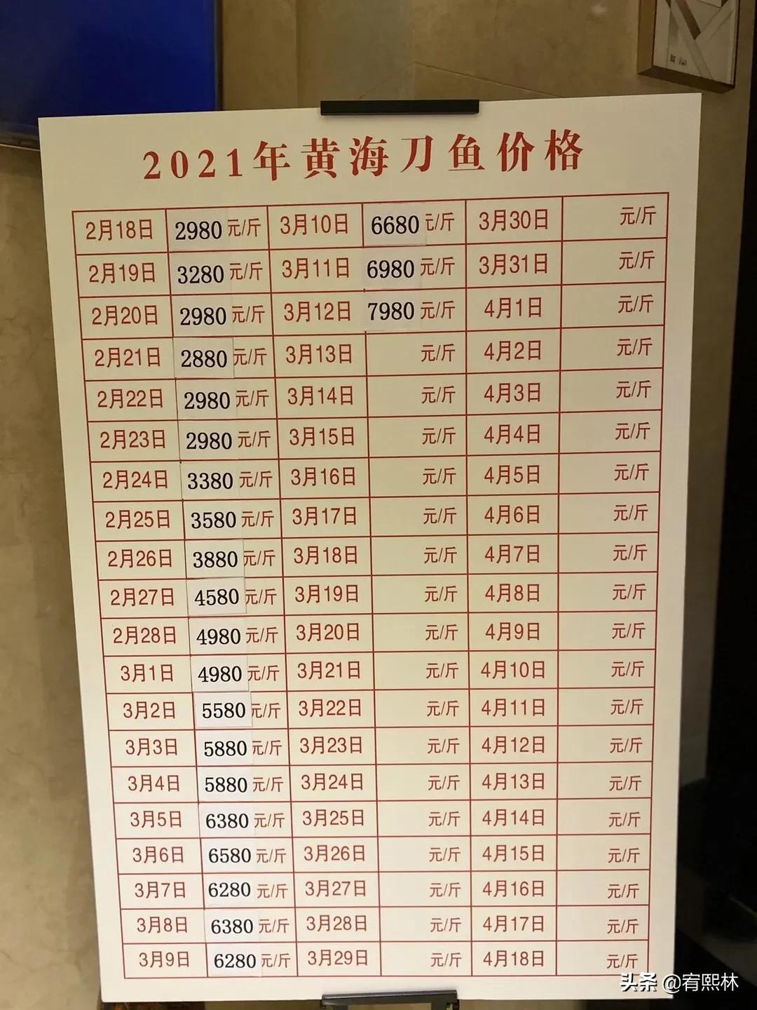 最近一段时间,一张写着2021年黄海刀鱼价格的图片在朋友圈疯传。如图所示,黄海刀鱼的价格一路上扬,直逼8000元大关。有人在朋友圈疾呼,刀鱼疯了,你一个海刀凭什么这么贵?