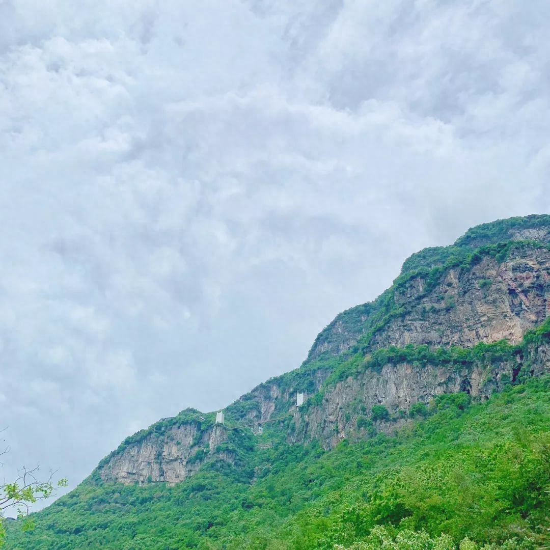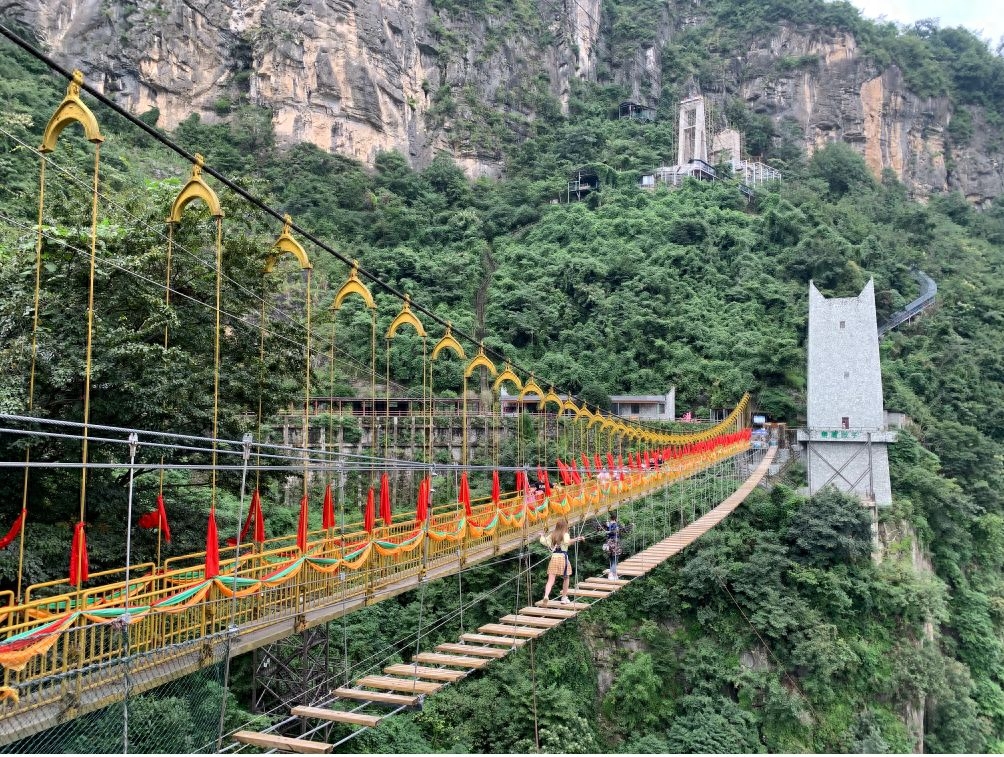 除了栈道,谷内还有另一处挑战心跳的地方——高空索桥“仙侣牧云桥”,隐匿于葱茏叠翠中、跨于幽深山谷间,和栈道相呼应,其惊险程度不相上下……