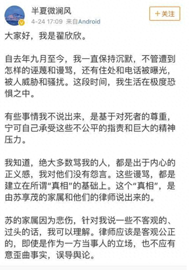 他的离世在网络中迅速传开,但翟欣欣却一直没有发表任何言论,反而是她的舅舅立即澄清跟翟欣欣很少来玩,也没有见过苏亨茂。