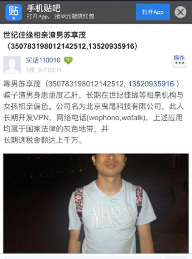 甚至在两个人交谈的过程中,翟欣欣给苏亨茂发布了一条:“你死啊,你死啊”的内容。在世纪佳缘贴吧上的身份信息跟公司违法灰色收入发帖公布了出来。