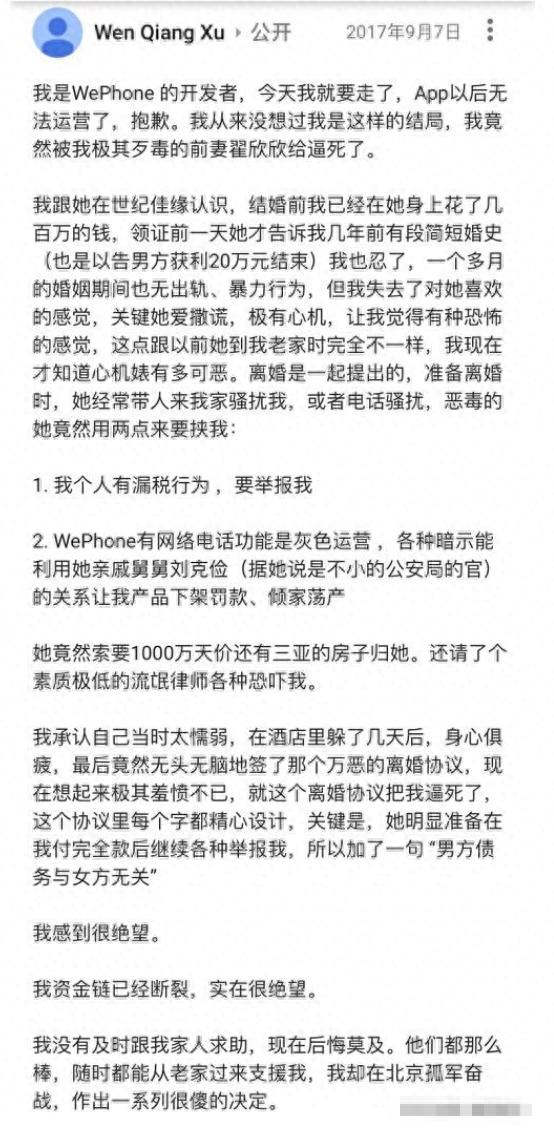 这封发布在社交媒体上的遗书,记录了他的前妻是如何逼迫他结婚,后又无奈选择离婚,甚至一步一步倾家荡产,走向死亡的深渊。