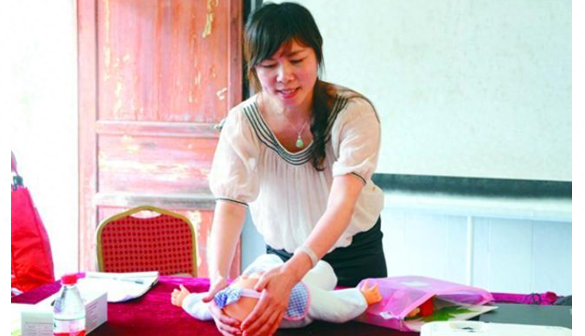 由于肚子太大,彭细妹行走不便,护士扶着彭细妹去做检查