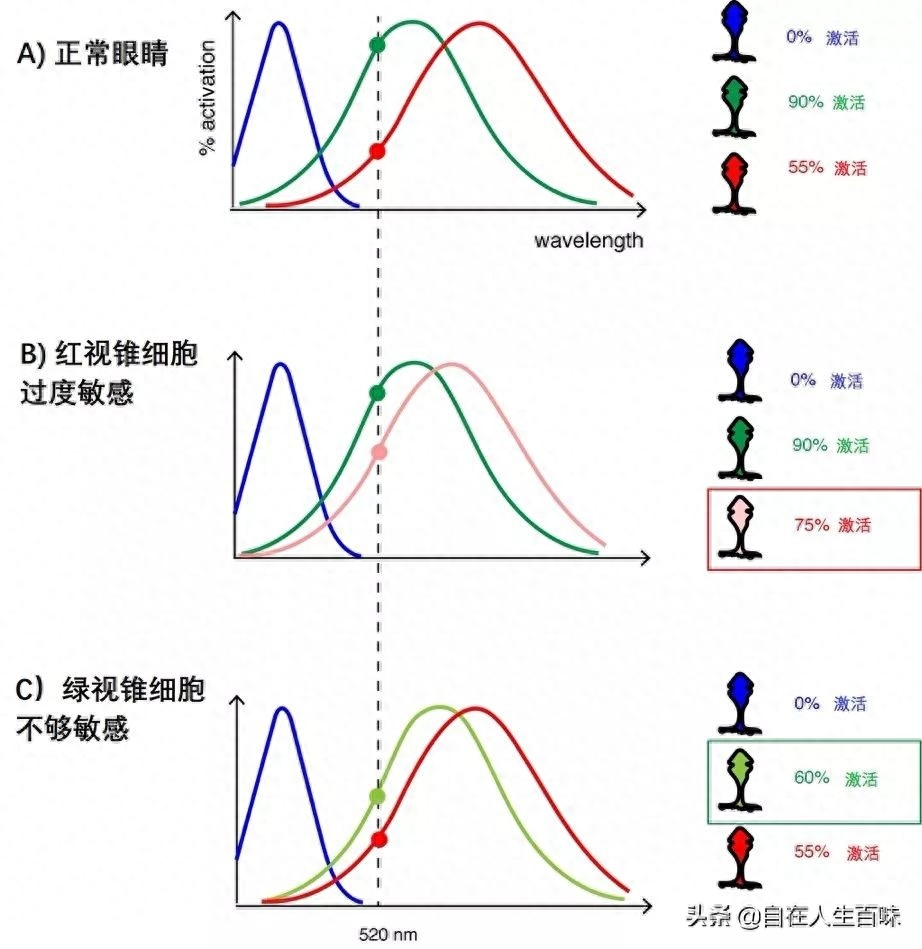 每一种感光细胞主要对一种原色光产生兴奋,而对其余两种原色光产生程度不等的反应,通过三种感光细胞的组合作用,我们就能看到多彩的世界。