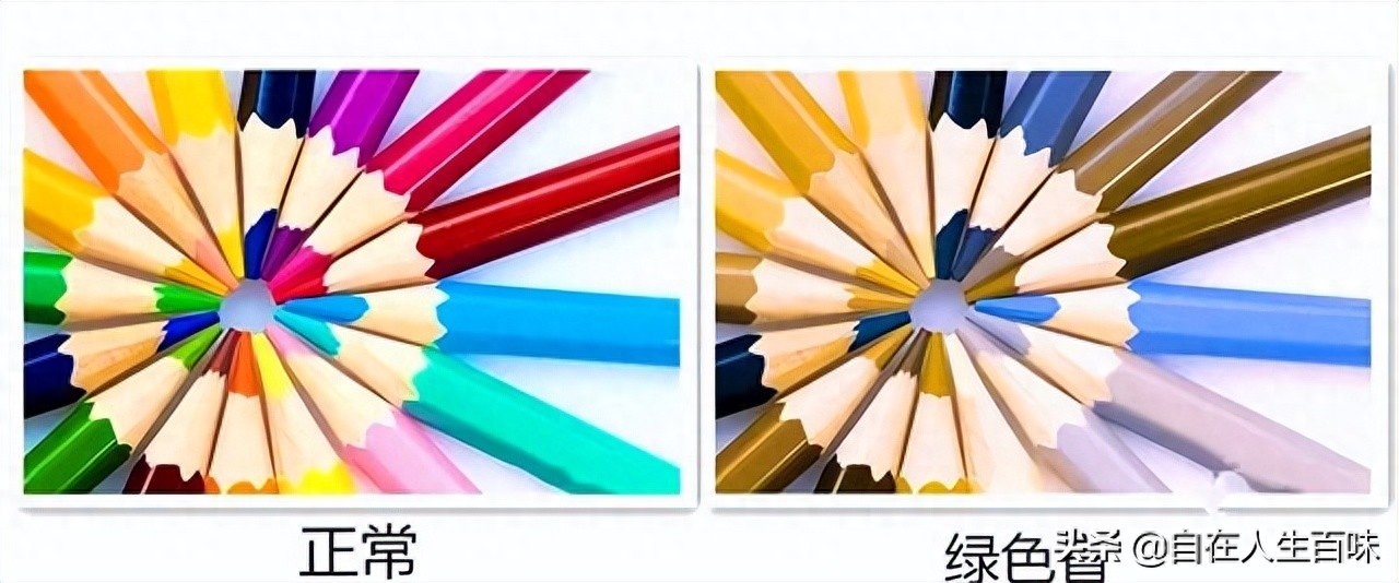 绿色盲的人不能分辨淡绿色与深红色、紫色与青蓝色、紫红色与灰色,把绿色视为灰色或暗黑色。